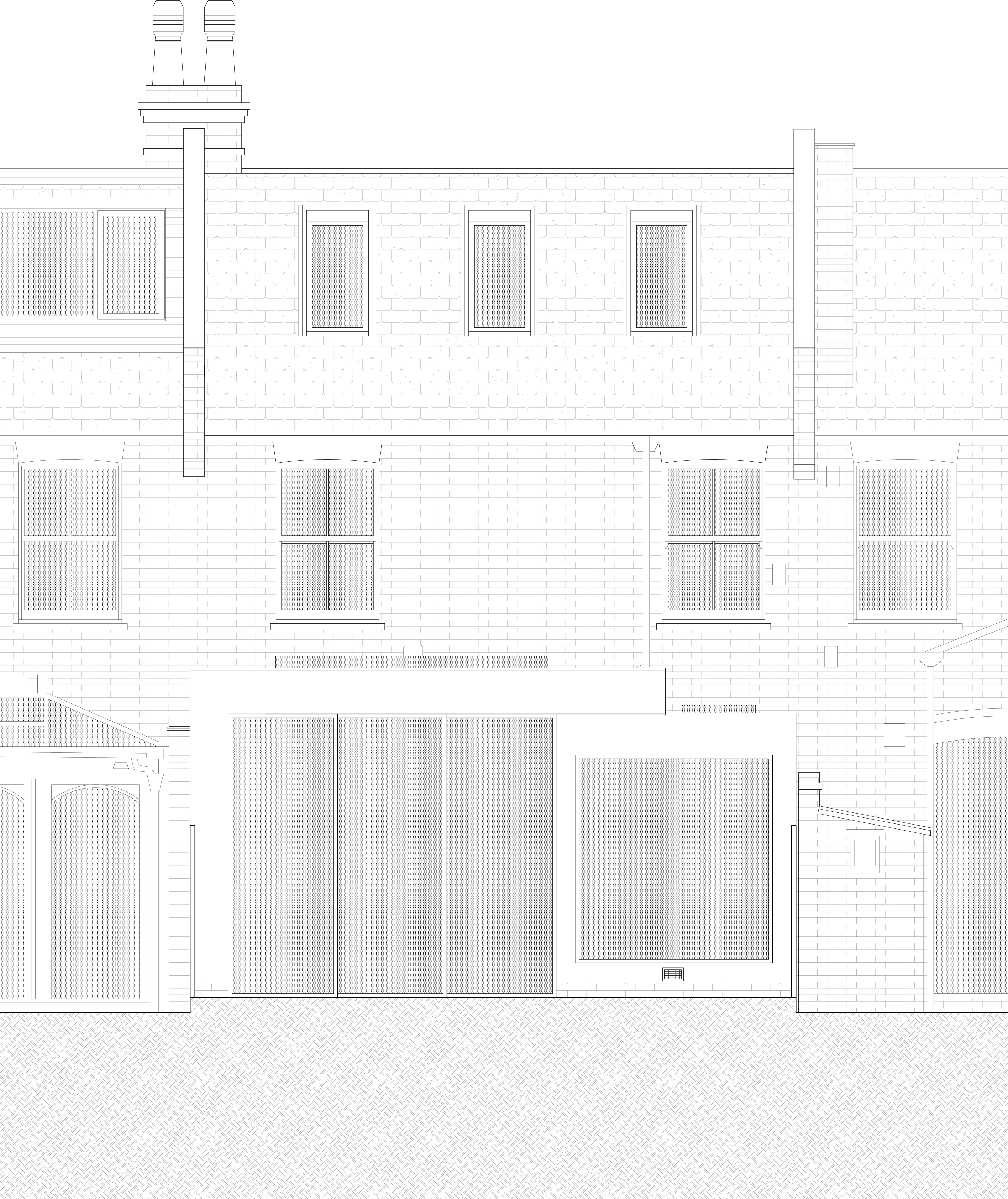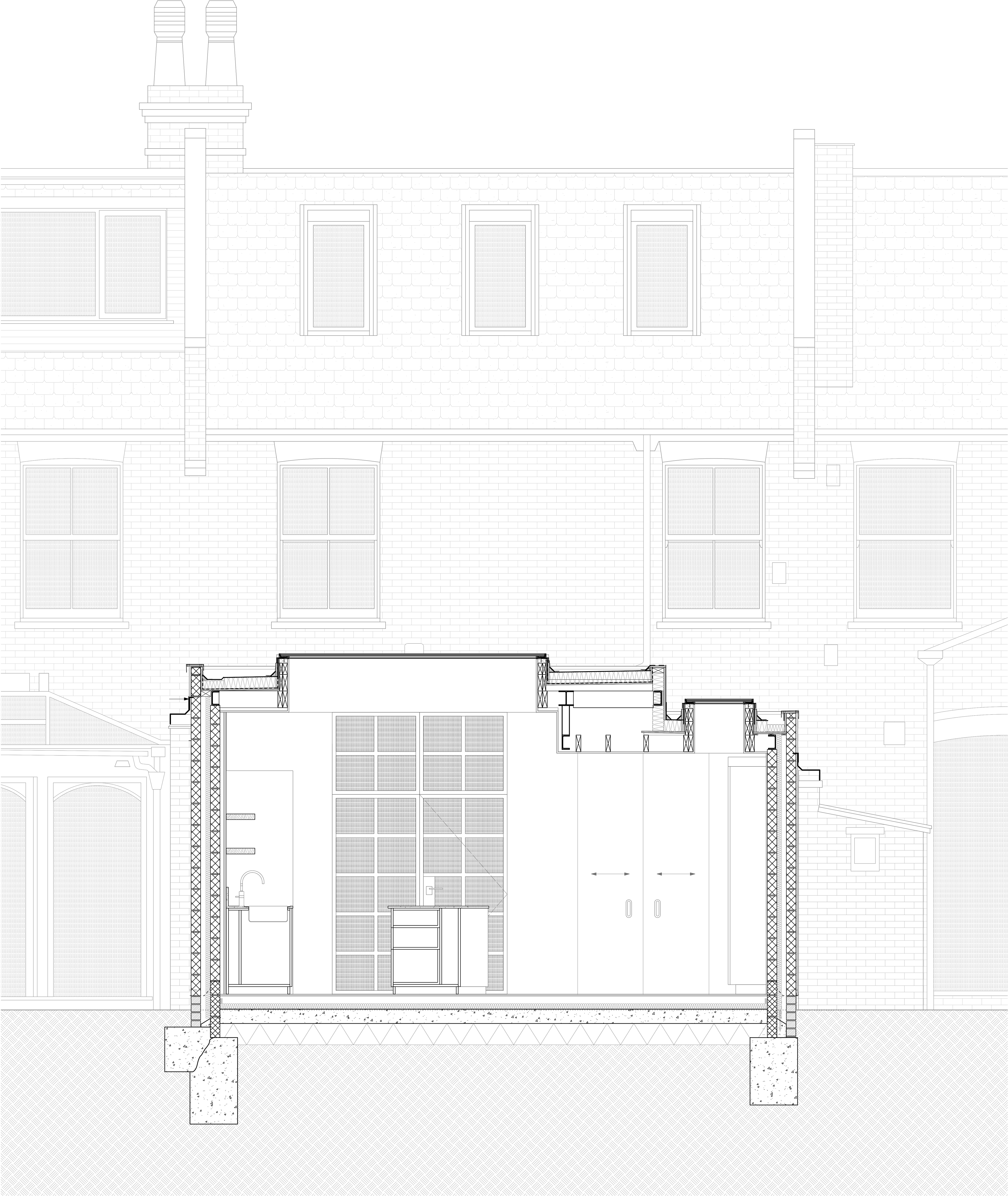 Elevation of and section through a rear extension to a Victorian terraced house Architectural design by Thomas de Cruz Architects & Designers Vectorworks